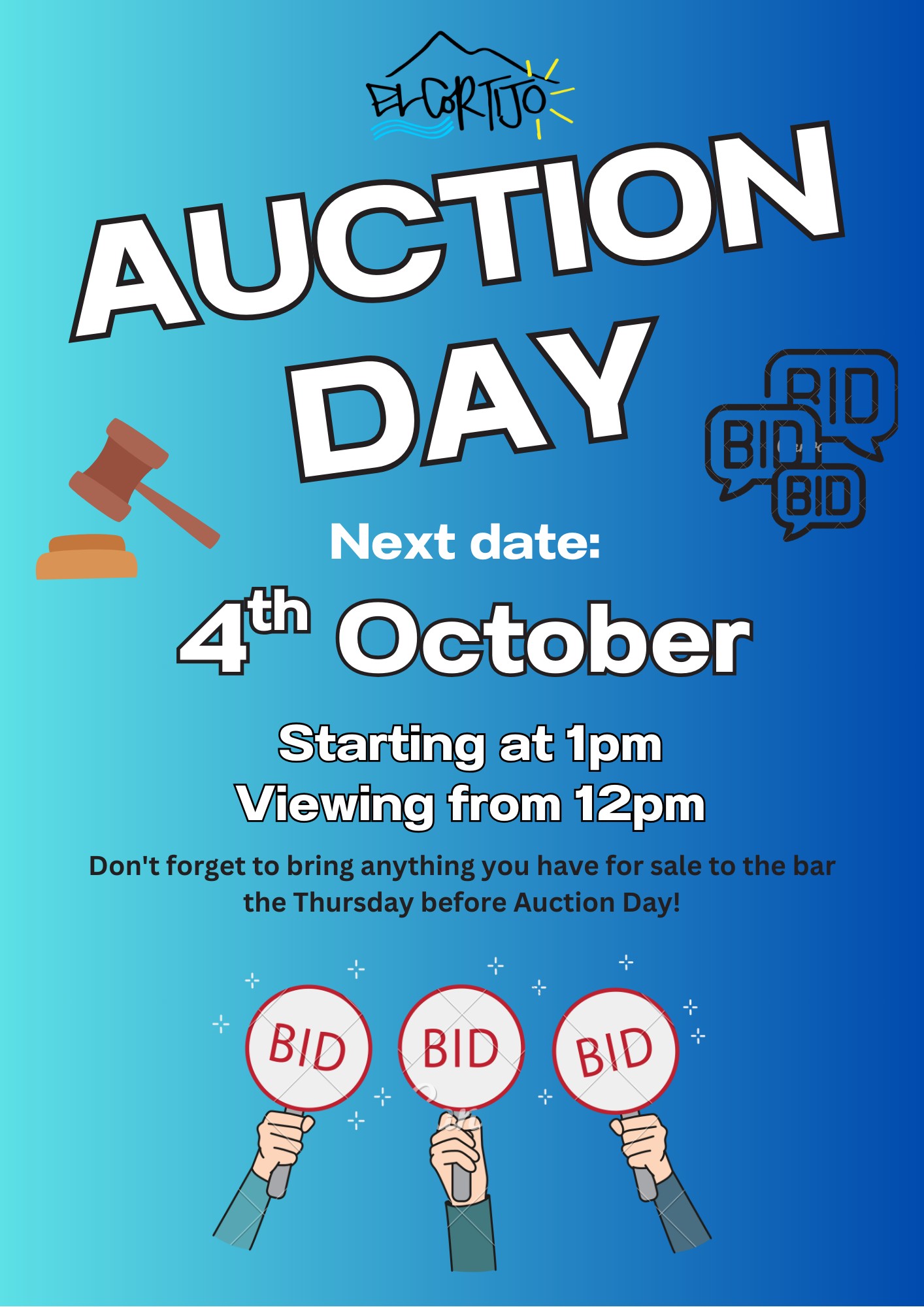 Our regular auction day Saturday 4th October. As usual viewing starts at 12 PM and the bidding starts at 1 PM at El Cortijo Paredon.