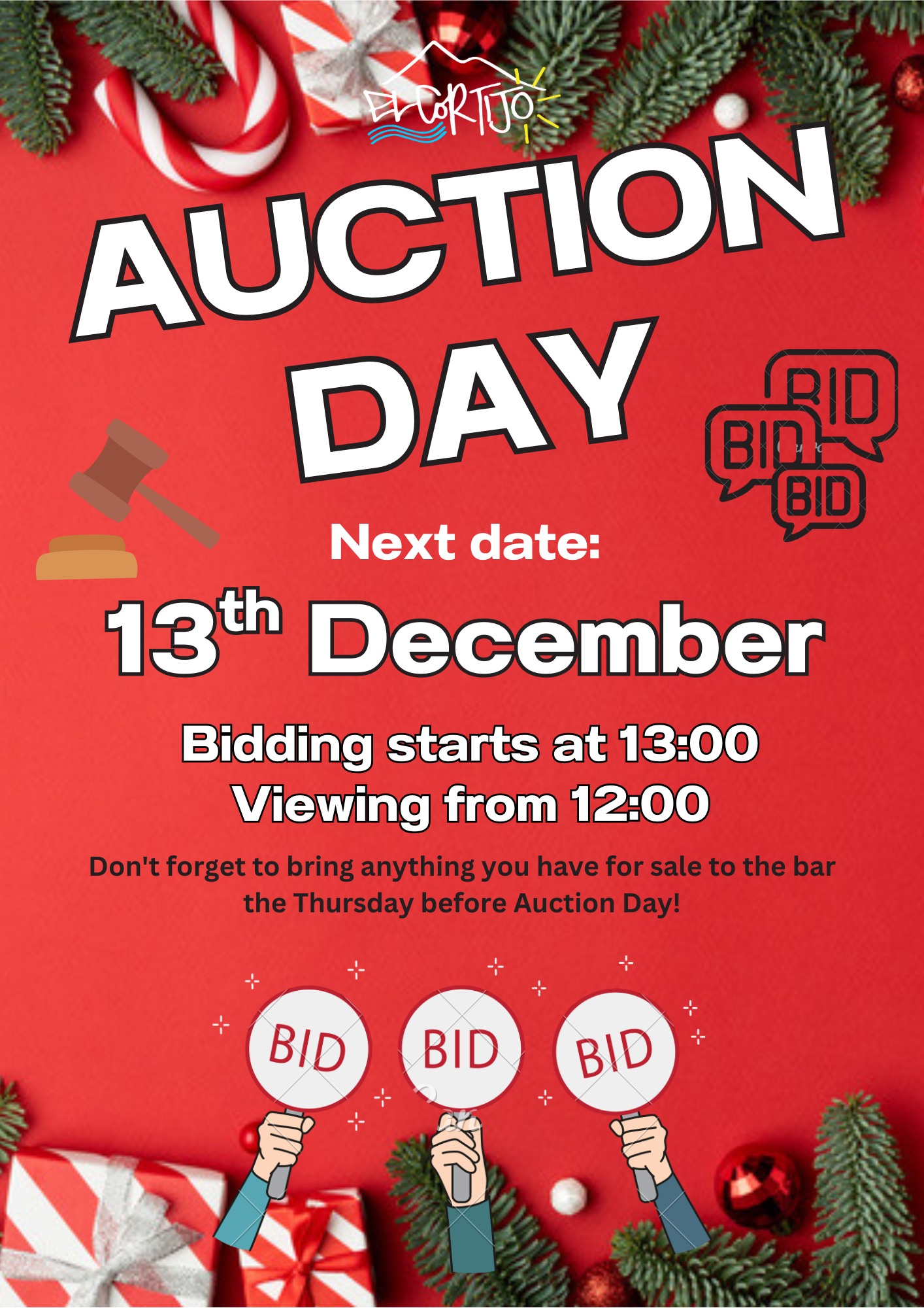 Our regular auction day Saturday 13th December. As usual viewing starts at 12:00 and the bidding starts at 13:00 at El Cortijo Paredon.